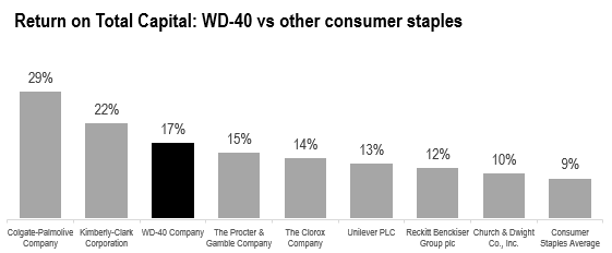 The WD-40 brand’s strong recognition is arguably the company’s primary competitive advantage. Its wide range of practical uses offers a compelling value proposition for customers, making it a household name across generations. This strong brand equity allows WD-40 to deliver returns comparable to those of major consumer staples companies like P&G, Unilever, Clorox, and Colgate.