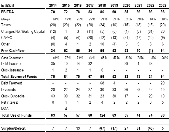WD-40 has maintained an average cash conversion rate of 60% of EBITDA (calculated as free cash flow divided by EBITDA) over the past decade. Free cash flow has increased from $34 million in 2014 to $94 million. While the company typically has low working capital requirements, it increased its inventory levels in 2022 to secure raw materials and finished products, mitigating the risk of supply chain disruptions.