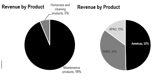 By the end of the fiscal year 2023, WD-40 Company reported revenue of $537 million. Approximately 94% of this revenue came from maintenance products, with the remainder from homecare and cleaning products. Geographically, revenue distribution was fairly balanced, with over 49% from the Americas, 36% from EMEA, and 15% from APAC.