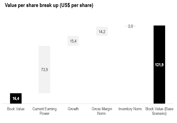 Breaking down the value creation drivers, it becomes clear that a significant portion of the stock's value relies on the company's ability to sustain long-term growth and enhance its current profitability, while most of its value comes form the existent earning power achieved by it current brand recognition.
