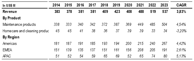 The company's revenue growth has been primarily driven by its Maintenance Products segment, which has grown at a 4.5% CAGR from 2014 to 2023. In contrast, the Homecare and Cleaning Products segment has experienced a decline, with an annual decrease of 3.2% over the same period. The disparity in performance between these segments can be attributed to several factors: